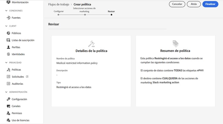 Una vez definidas las etiquetas y las acciones de marketing, puede crear políticas de gobernanza de datos que vinculen estos dos elementos. Por ejemplo, puede configurar una política que asocie una etiqueta “ePHI” con una acción de marketing de “direccionamiento de correo electrónico”, lo que garantiza que los campos etiquetados como “ePHI” no se utilicen para personalizar los mensajes de correo electrónico. Aprenda a crear políticas de gobernanza de datos