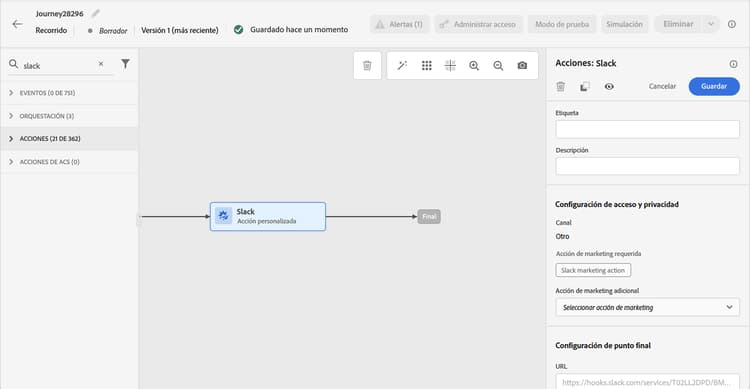 Cuando vaya a utilizar la acción personalizada del Slack configurada con la acción de marketing del Slack en un recorrido, se aprovechará la política asociada.
