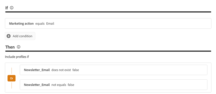 Por ejemplo, para enviar comunicaciones solo a los clientes que no hayan optado por no recibir boletines de correo electrónico, cree una directiva personalizada y defina la siguiente condición: