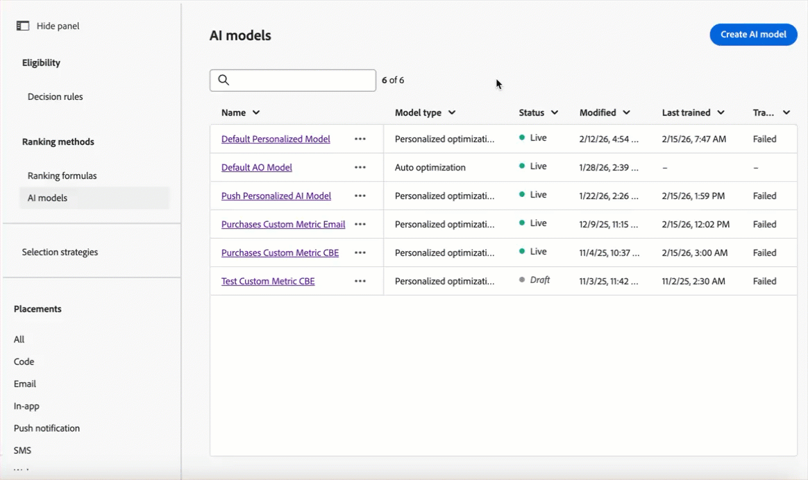 Journey Optimizer ahora le permite monitorizar el estado, el estado de formación y el rendimiento de sus modelos de IA de decisiones. Esto le permite verificar el éxito de la formación, solucionar problemas de errores y comprender el impacto en los resultados para seleccionar las mejores ofertas para cada cliente que utiliza IA. Tenga en cuenta que esta capacidad solo está disponible para Decisioning (no para los modelos de Administración de decisiones heredados).