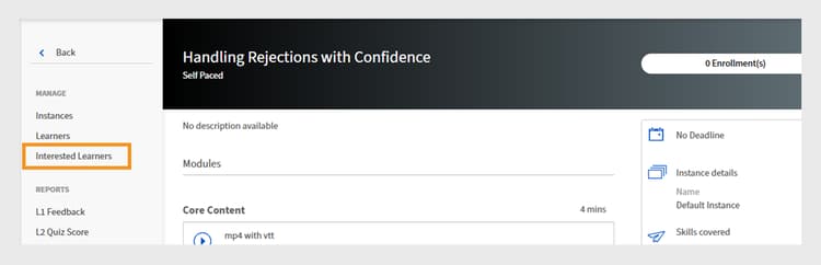 Los administradores pueden ver el interés de los alumnos y descargar el informe de alumnos interesados desde la página Resumen del curso .