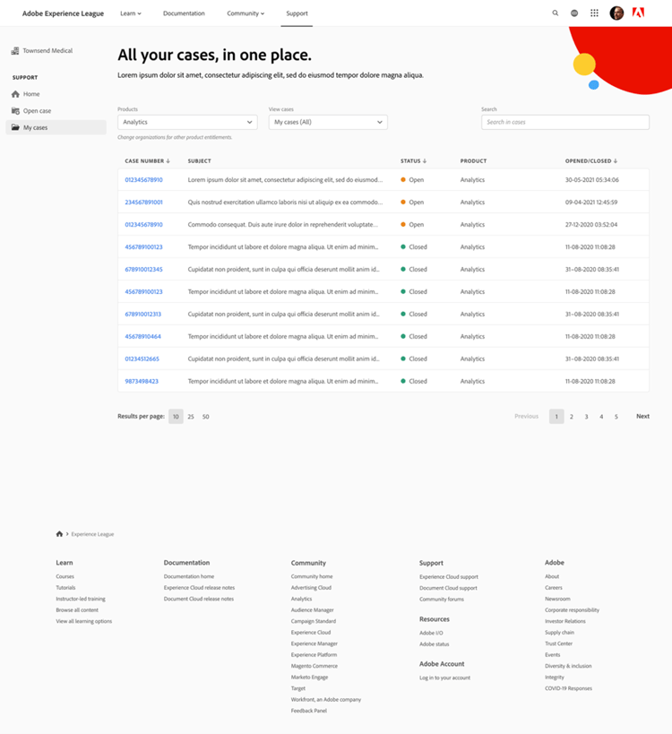 Una vez que hagas clic en Enviar caso, se te redirigirá a la página Mis casos, donde puedes ver todos los casos que tu organización ha enviado. También puede ir a esta página haciendo clic en el botón Mis casos en el menú de la barra lateral. En esta página, podrá ver todos los casos de asistencia técnica abiertos y cerrados. Con las opciones de la parte superior de la página, puede filtrar por estado de caso (abierto o cerrado) o por solución de Experience Cloud. También puede usar la barra de búsqueda para buscar cualquier palabra clave relacionada con sus problemas de soporte.