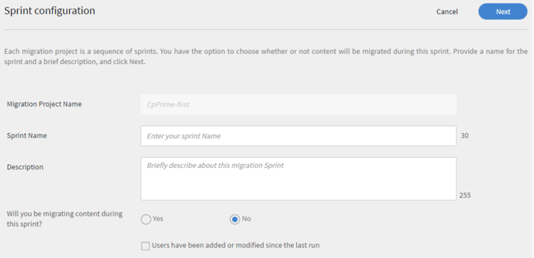 En la página Configuración de sprint, cree un sprint para su proyecto de migración. En el proceso de migración de Learning Manager, un sprint se define como un conjunto de elementos de migración que ha decidido migrar desde el LMS actual.