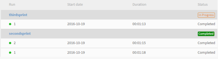 Para ver la lista de todos los sprints de un proyecto de migración, haga clic en Sprint en el panel de navegación izquierdo. Puede ver una lista de todos los sprints, la cantidad de ejecuciones que ejecutó para cada sprint, la fecha de inicio, la duración y el estado de finalización, tal como se muestra en la captura de pantalla de ejemplo a continuación.