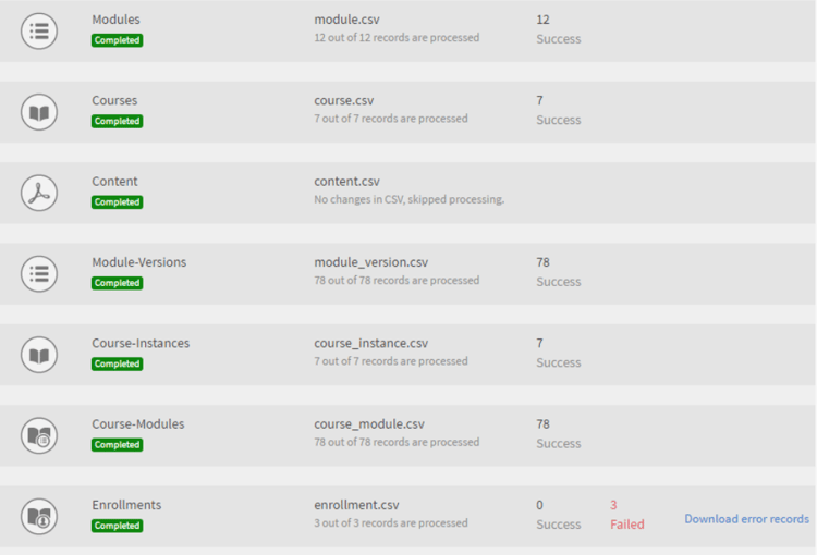 A continuación se proporciona una captura de pantalla de ejemplo del proceso de migración para su referencia. Como se muestra en la captura, puede ver el número de registros procesados para cada elemento de datos de migración, junto con el estado de elementos correctos y fallidos. Haga clic en Descargar registros de errores para los elementos fallidos a fin de descargar y ver los registros de errores. Puede solucionar los errores en CSV y cargarlos de nuevo en FTP.