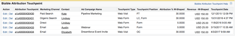 El Objeto Buyer Attribution Touchpoint cuenta la historia de las interacciones de marketing de sus contactos relacionadas con una oportunidad. Muestra los datos de atribución relacionados con los Touchpoints de marketing. Este objeto le permite ver cuánto crédito de ingresos se atribuye a cada Touchpoint de marketing. El tipo de modelo de atribución que utiliza determinará el porcentaje de ingresos atribuidos a los Touchpoints.