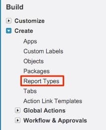 Vaya a la opción de instalación en Salesforce. Desde allí, expanda la agrupación "Crear" y seleccione Tipos de informes.