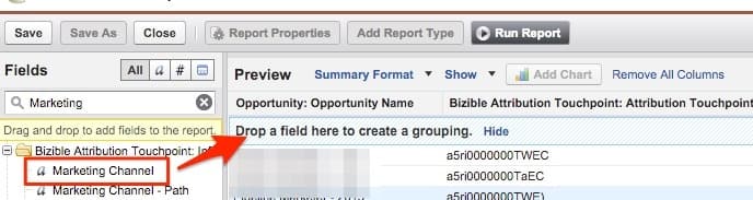 Ahora, se agregarán campos al informe. En la búsqueda rápida de la izquierda, escriba "Canal de marketing" y agréguelo a la agrupación Resumen del informe.