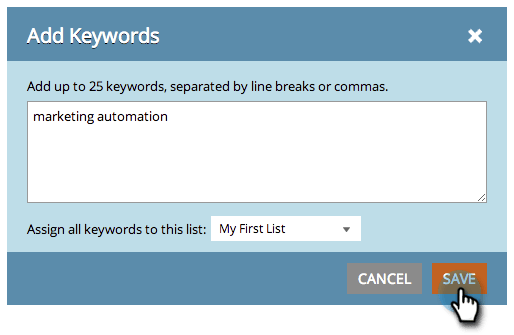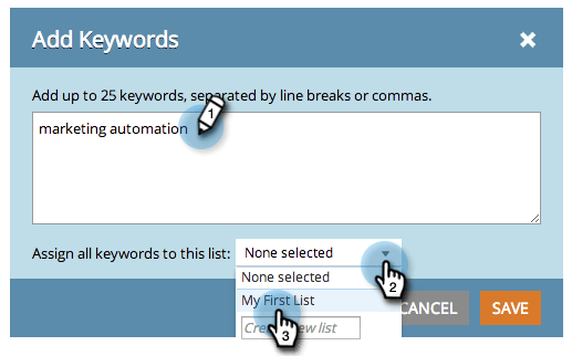 Introduzca la palabra clave. Seleccione una lista a la que agregarla desde la lista desplegable.