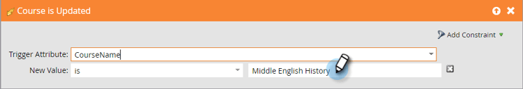 En la lista inteligente de una campaña inteligente, puede almacenar en déclencheur una acción de flujo cuando se agrega un objeto personalizado a una persona o compañía. También puede crear una lista inteligente que use change en un objeto personalizado como déclencheur. Por ejemplo, utilícelo para enviar un correo electrónico cuando se actualice un nombre de curso.