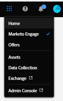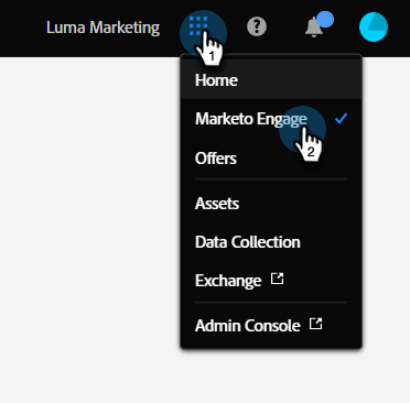 Si ya ha iniciado sesión en un producto de Adobe Experience Cloud, simplemente haga clic en el icono de menú y seleccione Marketo Engage.