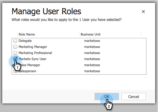 Asigne la función Usuario de sincronización de Marketo únicamente al usuario de sincronización de Marketo. No es necesario asignarlo a ningún otro usuario.