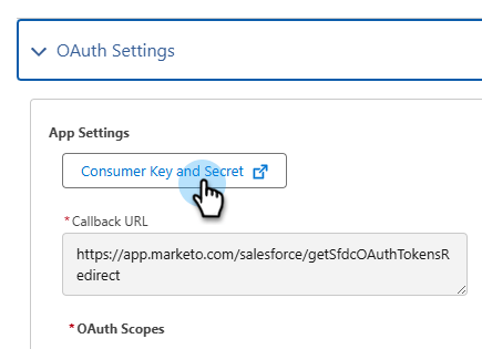 Haga clic en el botón Secreto y clave del consumidor, y aparecerá una nueva pestaña. Copie y guarde ambos números (los necesitará más adelante para usarlos en Marketo Engage).