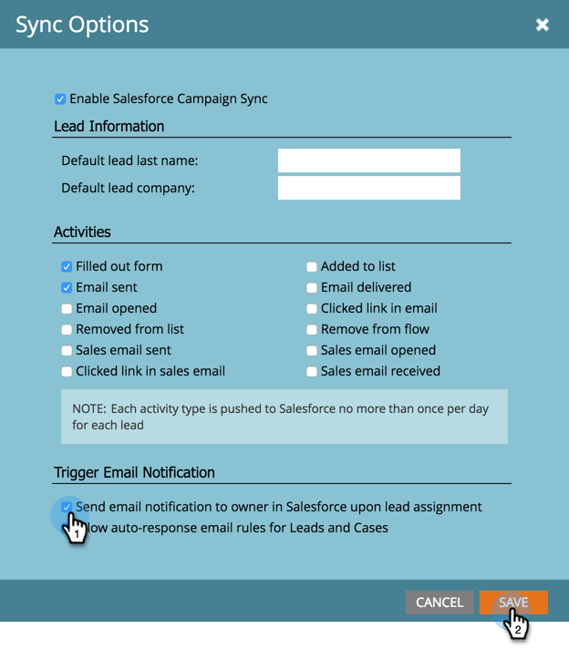 Desmarque la casilla Enviar notificación por correo electrónico al propietario en Salesforce tras la asignación de posibles clientes. Haga clic en Guardar.