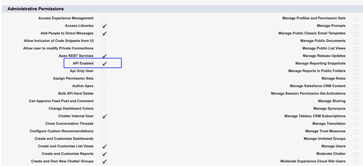 En la sección Permisos administrativos, asegúrese de que la opción API habilitada esté seleccionada.