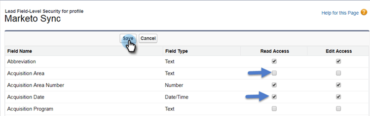 - Cuando termine de deshabilitar todos los campos innecesarios, compruebe Acceso de lectura y Editar acceso para ver los siguientes campos de objeto. Haga clic en Guardar cuando termine.