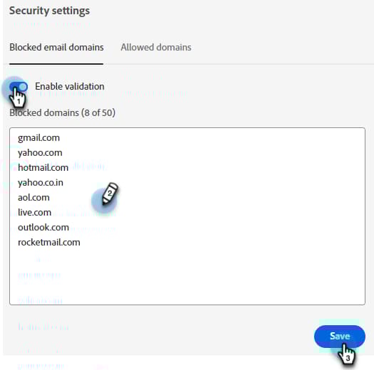 Seleccione el regulador Habilitar validación para activar la lista de permitidos. Introduce los dominios permitidos y haz clic en Guardar.