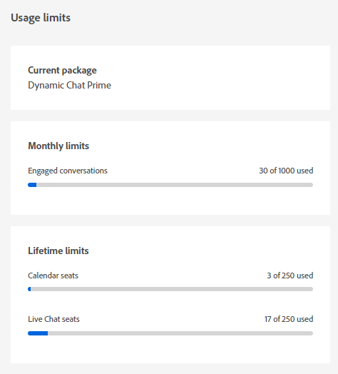 Mira tu paquete actual, el estado del límite mensual para las conversaciones que participan y el estado del límite de duración para los puestos de Calendario/Chat en vivo.