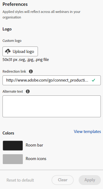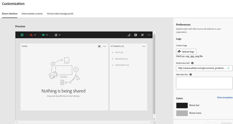 Puede personalizar el aspecto de la sala de sesiones cambiando el logotipo, el vínculo de redirección en el que se puede hacer clic y los colores. Los cambios se reflejarán en todos los eventos y salas de su organización.