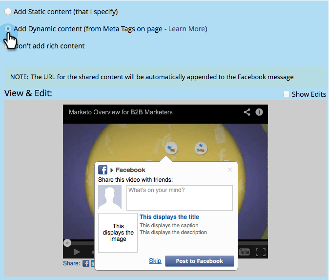 Las aplicaciones sociales de Marketo permiten que tus clientes potenciales compartan tus páginas de aterrizaje con sus conexiones en redes sociales como Facebook, Twitter, etc. Las etiquetas OpenGraph de Facebook (etiquetas OG) le permiten especificar qué información de la página de aterrizaje se incluye en las publicaciones de Facebook.