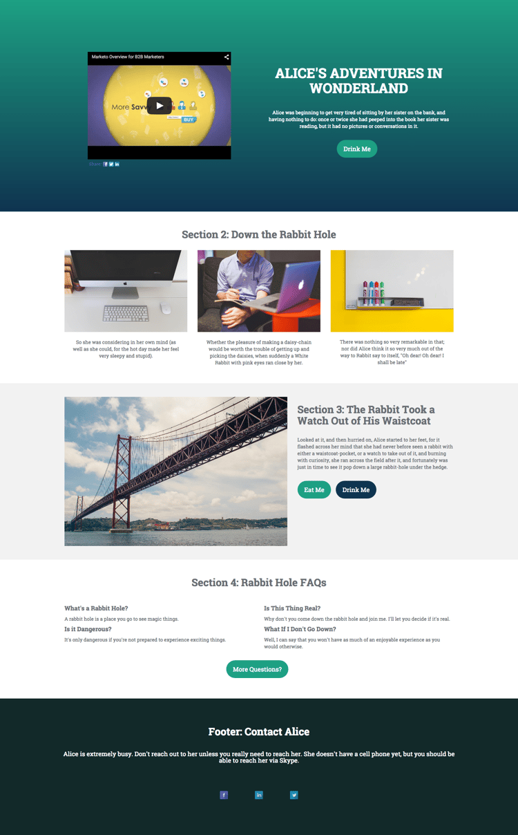 - incluye un vídeo, un encabezado, texto independiente y un botón.