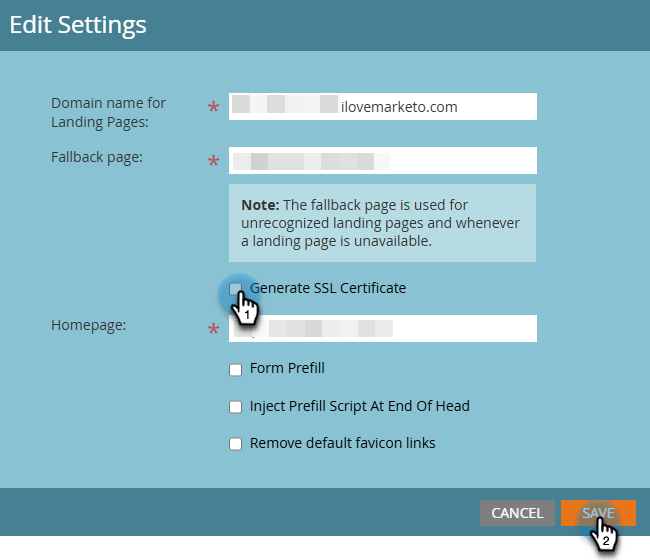Al rellenar un formulario web o visitar una página de aterrizaje alojada en Marketo Engage, la información se envía de forma predeterminada a través de un protocolo no seguro (HTTP). Según la política de su empresa, es posible que desee proteger la información enviada a Marketo a través de (HTTPS). Por ejemplo, cuando visite http://info.mydomain.com/, ahora será https://info.mydomain.com/.