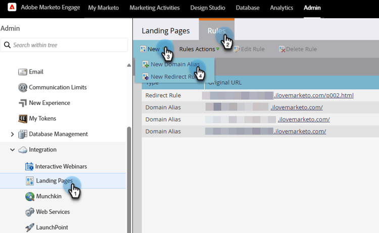 Seleccione Páginas de aterrizaje del árbol. En la ficha Reglas, haga clic en la lista desplegable Nuevo y seleccione Nuevo alias de dominio.