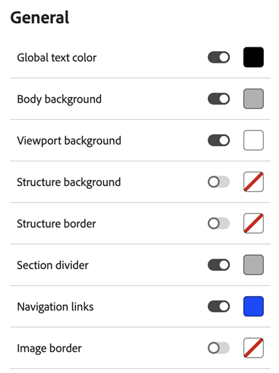 Esta configuración le permite establecer colores para el cuerpo, estructuras, fondos, contenedores, imágenes y mucho más.