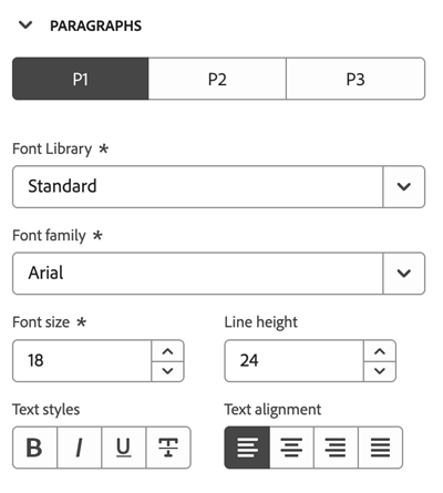 Defina la biblioteca de fuentes, la familia, el tamaño, el estilo de texto y las alineaciones de texto para diferentes ajustes preestablecidos de párrafo.
