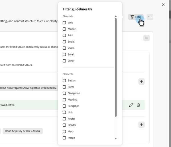 Haga clic en Filtro para filtrar las directrices por canal o tipo de elemento.