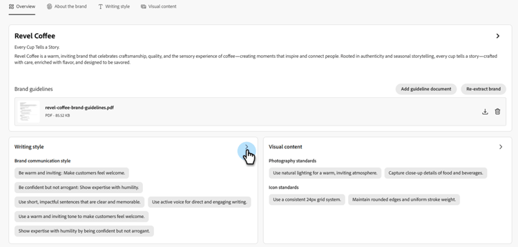 Para crear y administrar las directrices de marca, puede escribir los detalles usted mismo o cargar el documento de directrices de marca para que la información se extraiga automáticamente.