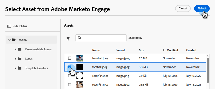 Haga clic en el icono Editar imagen para reemplazar la imagen existente de la variante. Elija el origen de la nueva imagen. En este ejemplo, elegimos la biblioteca Imágenes y archivos en nuestra suscripción a Marketo Engage.