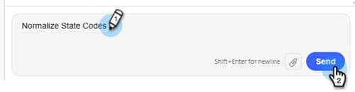Se le dirigirá a la pantalla de inteligencia artificial conversacional. En el panel izquierdo, el agente publica instrucciones, respuestas y opciones sobre las funciones de normalización de datos que se van a ejecutar.
