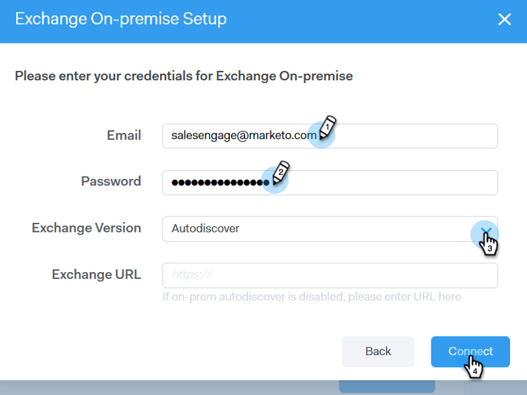 note note NOTE Si desactiva Detección automática en la lista desplegable Versión de Exchange, tendrá que pedirle a su departamento de TI la URL Exchange. Puede utilizar esta conexión para rastrear correos electrónicos y también como canal de envío.