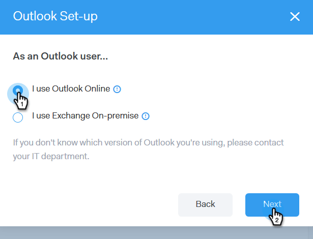 Seleccione la versión de Outlook que está usando y haga clic en Siguiente. En este ejemplo elegimos Outlook Online.