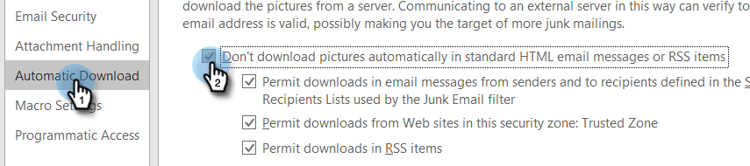 Haga clic en Descarga automática en el menú de la izquierda y active la casilla de verificación No descargar imágenes automáticamente en elementos de correo electrónico o RSS de HTML.