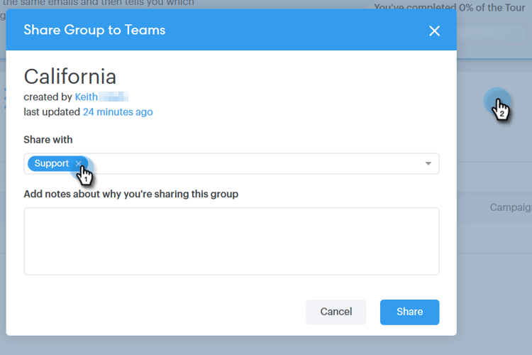 Haga clic en X junto al equipo con el que compartió el grupo y luego haga clic fuera del modal.