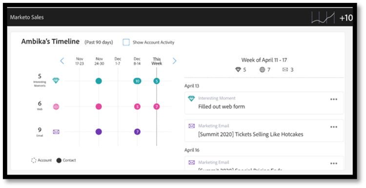 Sí, las actividades de participación en ventas se registrarán en Marketo como actividades nativas. Estas actividades también incluyen filtros nativos que se pueden utilizar con restricciones para dirigirse a posibles clientes en función de los atributos de la actividad de ventas.