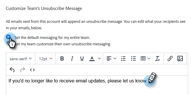 Siempre hemos permitido a los equipos personalizar su mensajería de vínculo de cancelación de suscripción, pero los administradores tienen la opción de configurar la mensajería de vínculo de cancelación de suscripción para todo su equipo a fin de garantizar una mensajería coherente.