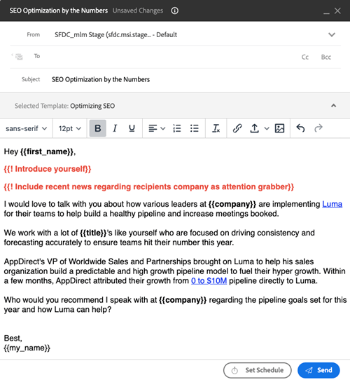 Cuando se utilizan avisos con campañas de ventas, es mejor usarlos con pasos manuales de correo electrónico. Estos pasos asignarán a un usuario una tarea de recordatorio para enviar el correo electrónico, lo que le ofrece la oportunidad de reemplazar las indicaciones por texto personalizado. Los pasos automáticos del correo electrónico en Campañas de ventas intentarán enviarse automáticamente, sin permitir que el usuario reemplace las indicaciones. Los mensajes que no se sustituyan provocarán que los mensajes de correo electrónico no se envíen.