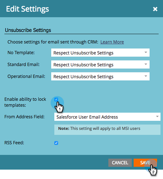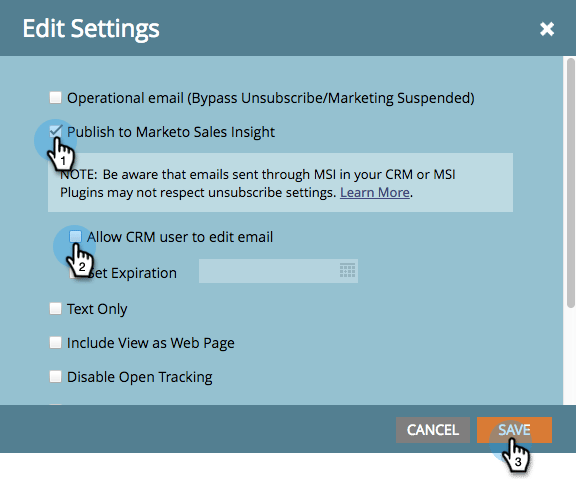 Marque Publicar en Marketo Sales Insight si aún no lo está. Ahora puede desmarcar Permitir que el usuario de CRM edite el correo electrónico para bloquear la plantilla. Haga clic en Guardar.