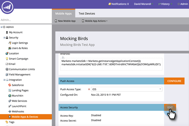 Para mejorar la seguridad de los usuarios de dispositivos móviles, Marketo proporciona dos nuevos identificadores: la clave de acceso y el secreto de acceso. Esto contribuye a garantizar que los usuarios que inician sesión en la aplicación sean quienes parecen ser.