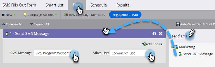 En la pestaña Flujo, arrastre el cursor sobre Enviar mensaje SMS. Seleccione la lista SMS Message and Vibes que desee en los desplegables.