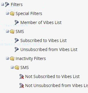 Por el contrario, el filtro Lista de miembros de vibraciones encuentra a cualquiera suscrito actualmente a vibraciones y es el más adecuado para usarlo en campañas o listas inteligentes.