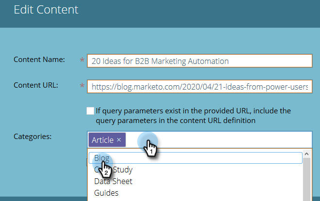 Realice cambios en Nombre de contenido y en URL de contenido (la casilla de verificación de parámetros de consulta es opcional).