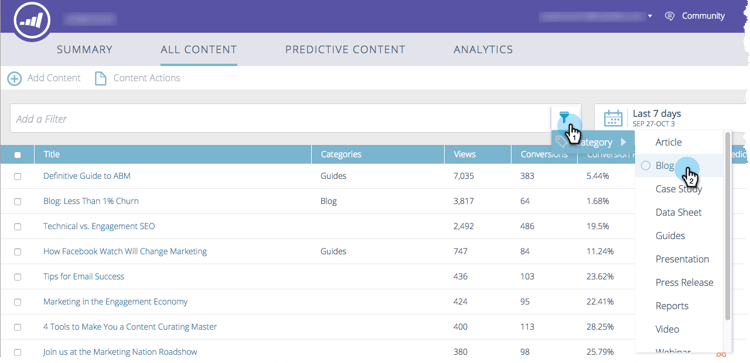 En la página Todo el contenido, haga clic en el icono de filtro y, en Categoría, seleccione una o varias categorías de contenido.
