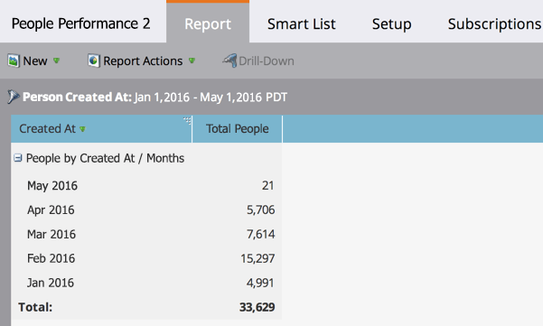 Use un informe de Rendimiento de personas para medir el crecimiento de la base de datos con el tiempo. Puede ver cuántas personas ha agregado y cuándo. Obtenga más información sobre las personas y evalúe sus programas. Agrupe los resultados por cualquier persona o atributo de compañía, o por segmentación.
