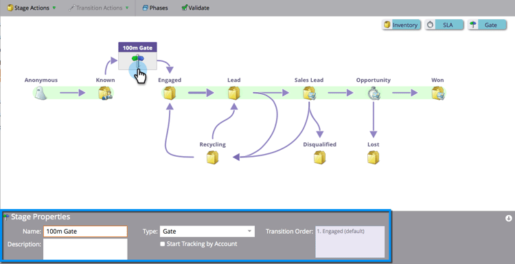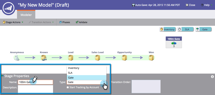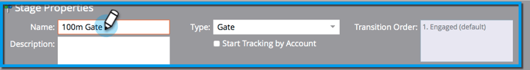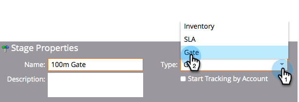 Edite Name, Description y ajuste Type de la fase de Gate. También puede optar por Iniciar el seguimiento por cuenta.