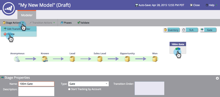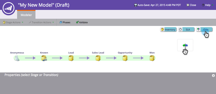 También puede eliminar una fase de Puerta si hace clic en ella y, a continuación, en la lista desplegable Acciones de fase, selecciona Eliminar.