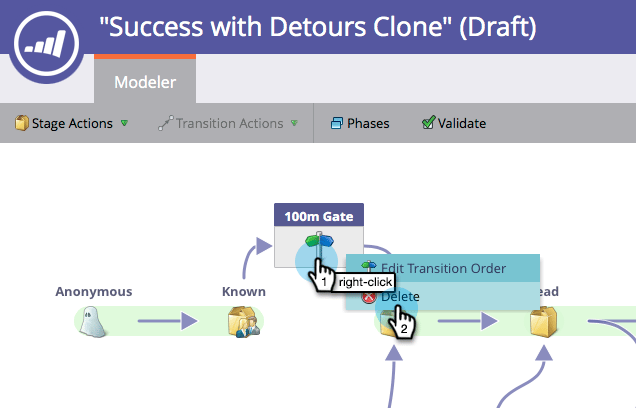 Para eliminar una fase de puerta, haga clic con el botón derecho en el icono de fase de puerta y seleccione Eliminar.